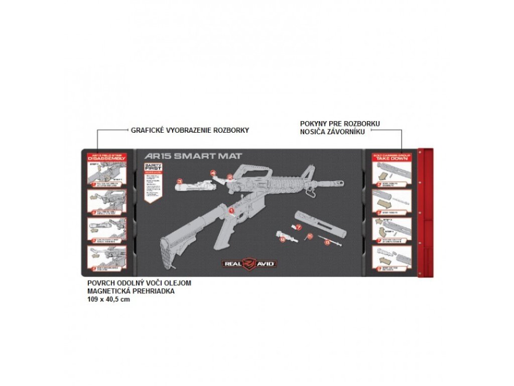 Profesionálna čistiaca podložka Real Avid s grafickým vyobrazením časti zbraní s platformou AR15 je dokonalým riešením pri čistení a úpravách.