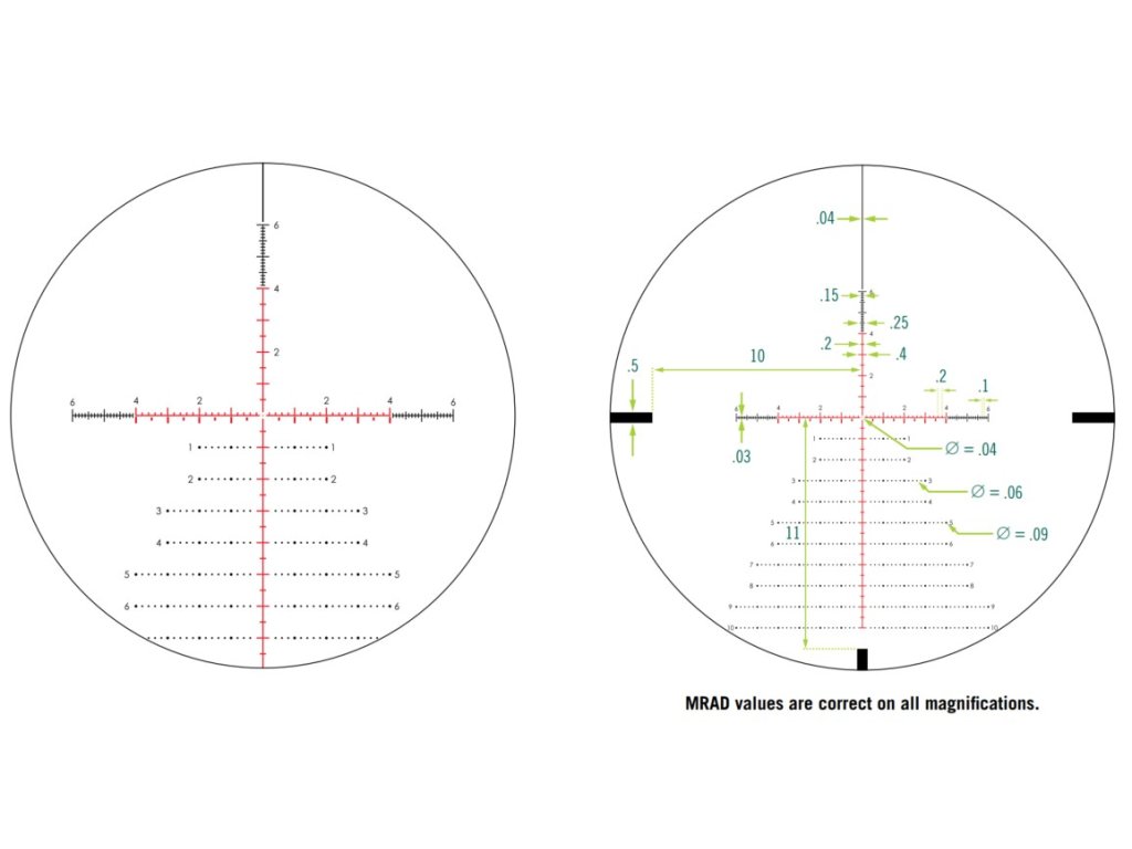 | Zameriavací kríž prvej ohniskovej roviny | Mierka nitkového kríža zostáva v pomere k zväčšenému obrázku. Konštantné subtenzie umožňujú presné držanie a rozsah pri všetkých zväčšeniach |